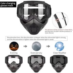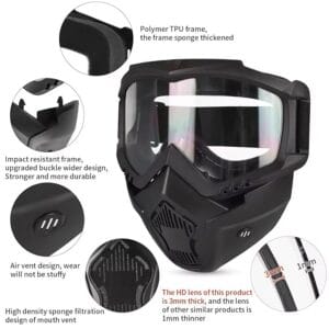 • DESIGN DETACHABLE : This 3 in 1 Face mask it comes to the design of this open face goggle mask, it is being offered with a detachable design. You can conveniently detach the mask and use it accordingly from time to time.