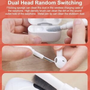• SEPARATE DOUBLE-HEAD HIDDEN DESIGN: A soft and light sponge brush head can easily clean the charging compartment. At the other end of the brush is the metal tip of the cleaning pen like a pen tip, which can clean the small parts and holes of the earplugs for deep cleaning of crevices and dirt. It also has a soft microfiber brush above the pen tip, which can deeply clean the tiny parts and holes of the earplugs.