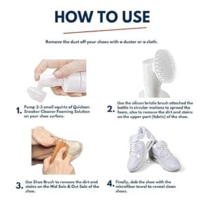 - How to Use – To use sport shoes cleaning kit effectively, Remove the dust off your shoes with a duster or a cloth. Pump 2-3 small Sneaker Cleaner Foaming Solution squirts on your shoe surface. Use the silicon bristle brush on the overhead of the bottle in circular motions to remove the dirt and stains and clean the shoe. Finally, dab the shoe with the microfiber towel to reveal clean shoes.