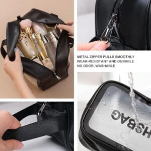 - CLEAR MAKEUP BAG: Our cosmetic bags are made of PU and PVC materials, wear-resistant, environmentally friendly and non-toxic. The transparent design allows you to easily find what you need.; LARGE CAPACITY CARRY POUCH: The size of the transparent travel bag is about 30x21x10 cm (LxWxH), it has enough space to store our items and meet different requirements for various purposes.